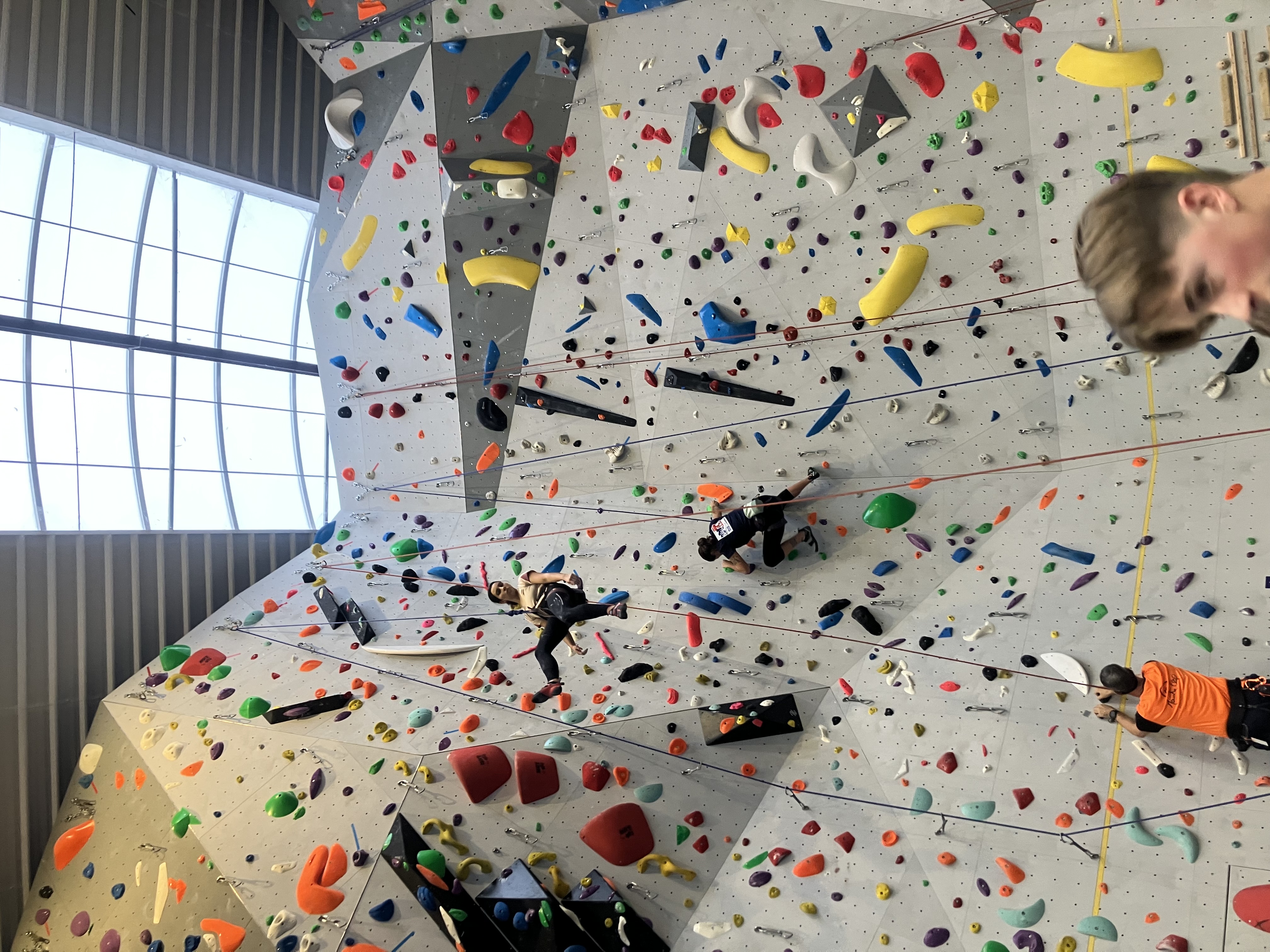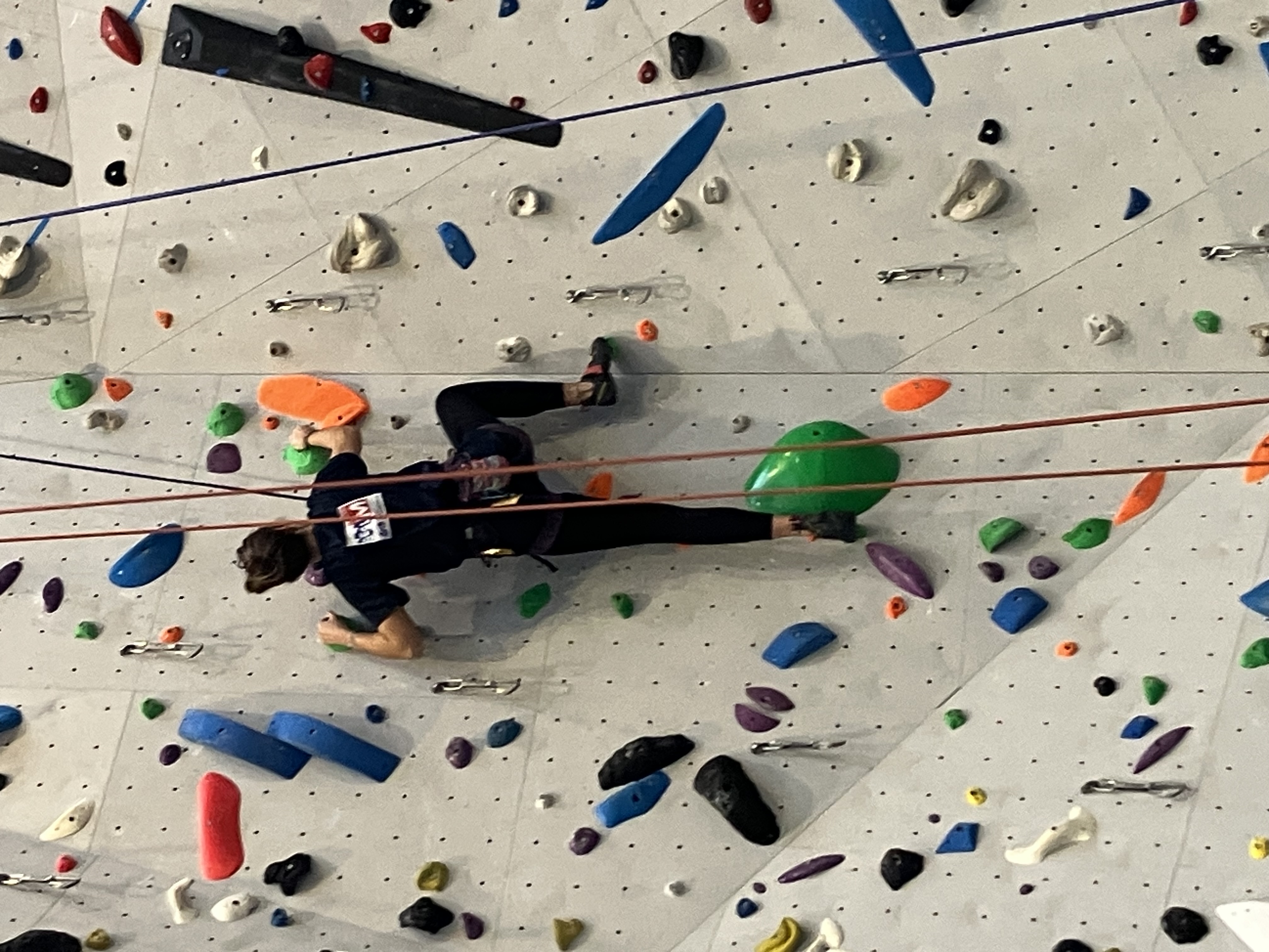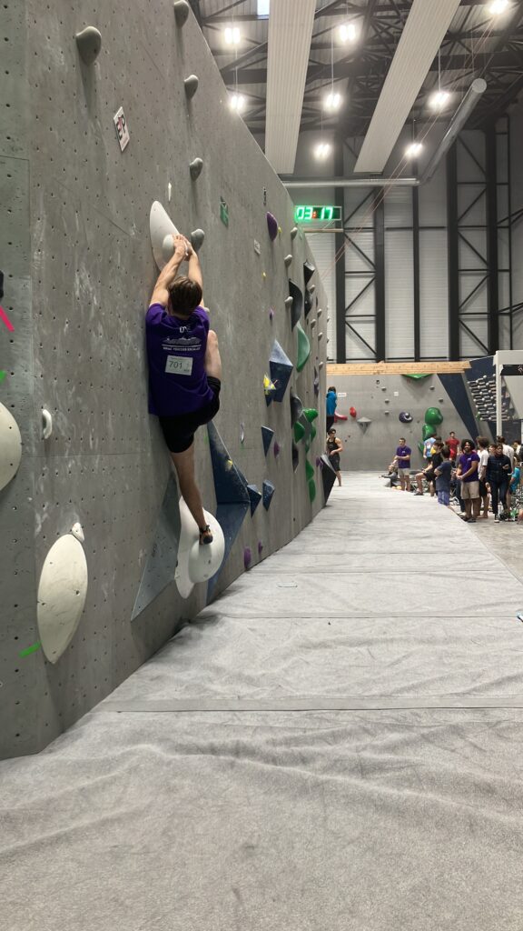 Pour la vitesse, on n’a pas totalement l’installation qu’il faut mais on à fait de notre mieux. Trois jeunes on participé en u13 et u15 sur la voie bleue u13 et la voie rouge u15 qui est un morceau si on veut déjà arriver en haut vu que c’est une partie de la voie adulte plus deux prises. On ira s’entrainer au mur de Croix Rousse pour la voie u13.